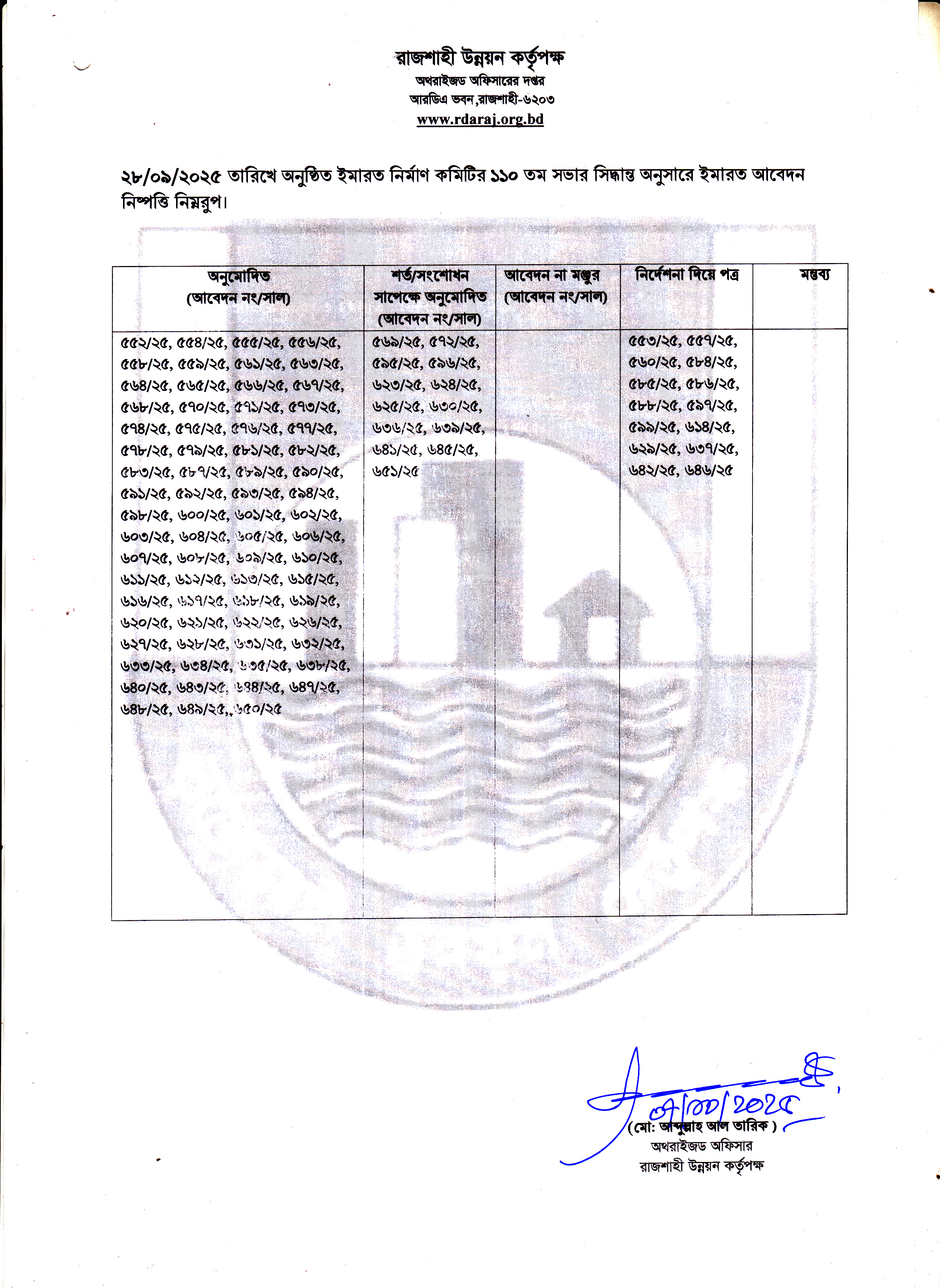 | ৪ | ২৮-০৯-২০২৫ খ্রিঃ তারিখে অনুষ্ঠিত রাজশাহী উন্নয়ন কর্তৃপক্ষের ইমারত নির্মাণ কমিটির ১১০ তম সভার সিদ্ধান্ত | ০৭-১০-২০২৫ | দেখুন |